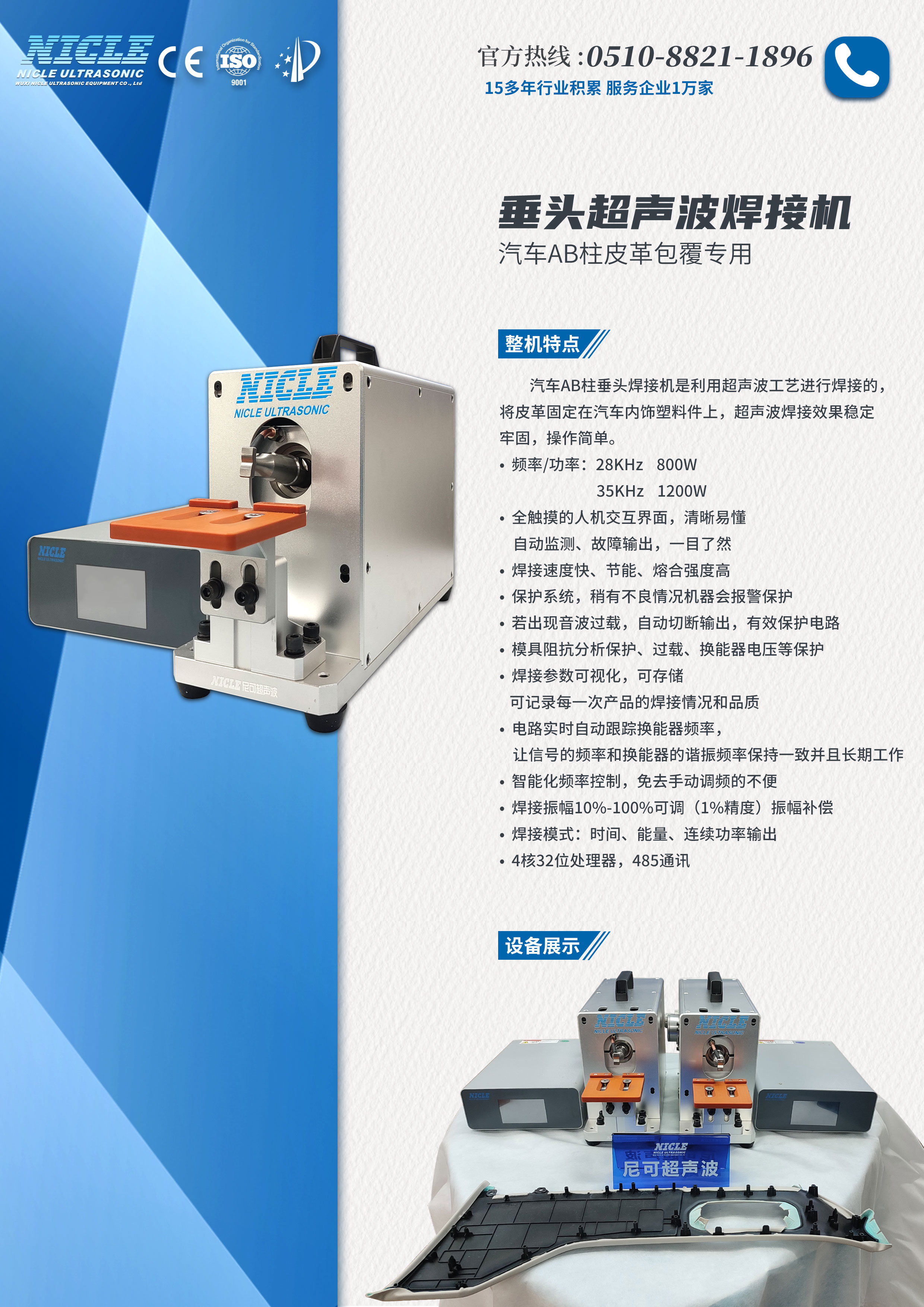 頻率/功率 28khz  800w 主要用于:汽車AB柱皮革包覆,將皮革通過超聲波焊接固定在汽車內(nèi)飾塑料件上,效果穩(wěn)定、牢固、操作簡(jiǎn)單。